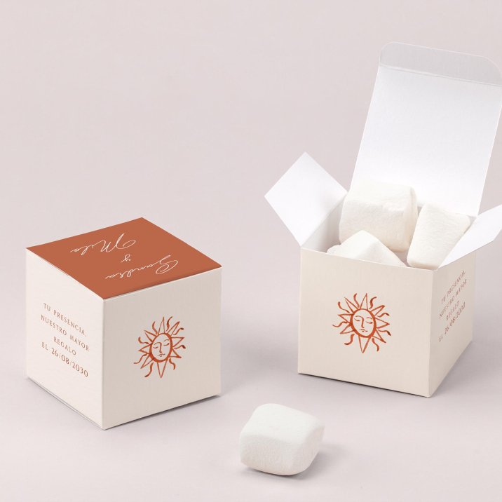 Esta cajita (de 5,4 x 5,4 cm) se puede rellenar con dulces, peladillas u otras sorpresas. Será un original regalo que podréis colocar sobre las mesas y regalar a vuestros invitados como recuerdo de vuestro maravilloso día.