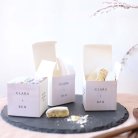 Esta cajita (de 5,4 x 5,4 cm) se puede rellenar con dulces, peladillas u otras sorpresas. Será un original regalo que podréis colocar sobre las mesas y regalar a vuestros invitados como recuerdo de vuestro maravilloso día.
