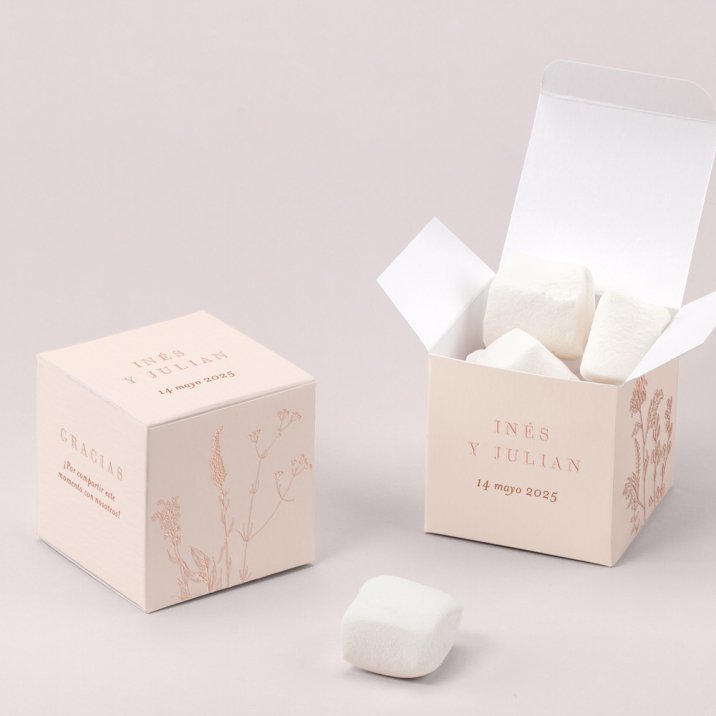 Esta cajita (de 5,4 x 5,4 cm) se puede rellenar con dulces, peladillas u otras sorpresas. Será un original regalo que podréis colocar sobre las mesas y regalar a vuestros invitados como recuerdo de vuestro maravilloso día.