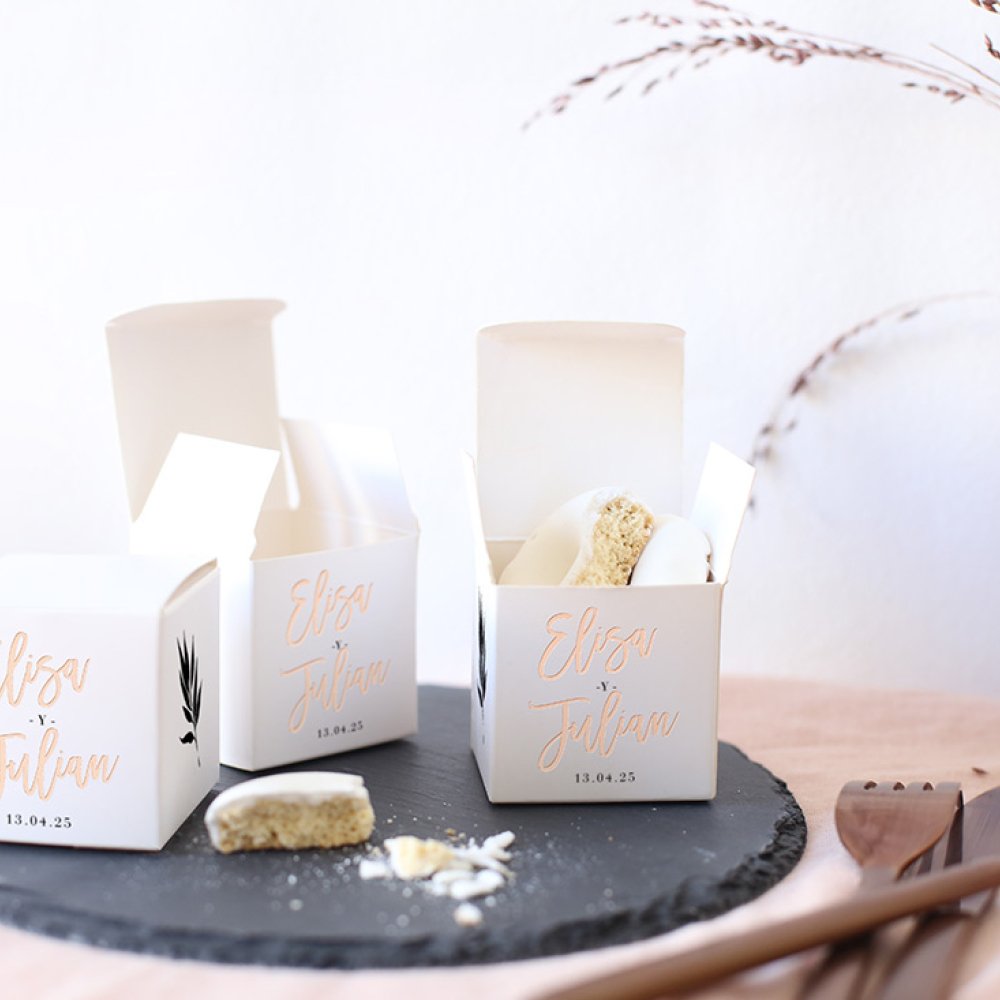 Esta cajita (de 5,4 x 5,4 cm) se puede rellenar con dulces, peladillas u otras sorpresas. Será un original regalo que podréis colocar sobre las mesas y regalar a vuestros invitados como recuerdo de vuestro maravilloso día.
