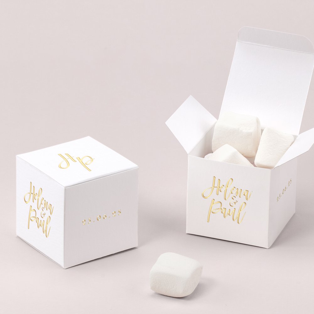 Como sugerencia podéis rellenarlas con nuestras peladillas elaboradas artesanalmente en el sur de Francia (propuestas como accesorio por separado). Os aconsejamos llenarlas con 20 peladillas por caja (50 g). Atención, las cajas vienen listas para montar.