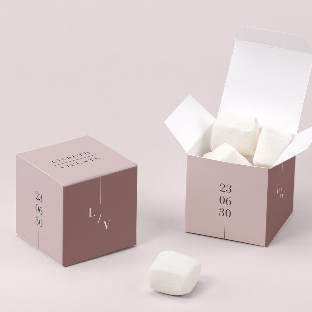 Esta cajita (de 5,4 x 5,4 cm) se puede rellenar con dulces, peladillas u otras sorpresas. Será un original regalo que podréis colocar sobre las mesas y regalar a vuestros invitados como recuerdo de vuestro maravilloso día.