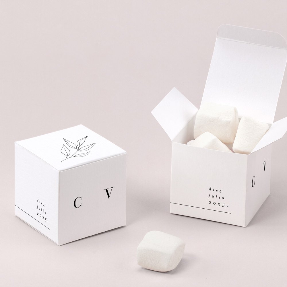 Esta cajita (de 5,4 x 5,4 cm) se puede rellenar con dulces, peladillas u otras sorpresas. Será un original regalo que podréis colocar sobre las mesas y regalar a vuestros invitados como recuerdo de vuestro maravilloso día.