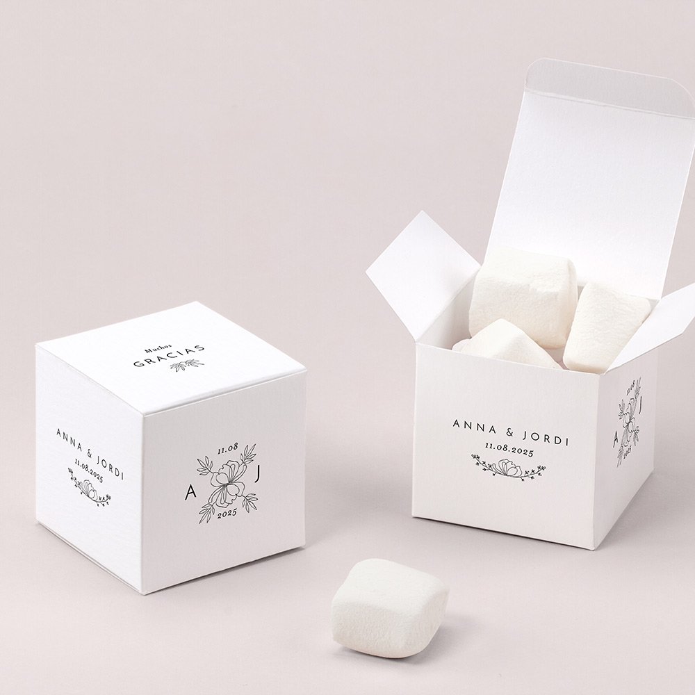Esta cajita (de 5,4 x 5,4 cm) se puede rellenar con dulces, peladillas u otras sorpresas. Será un original regalo que podréis colocar sobre las mesas y regalar a vuestros invitados como recuerdo de vuestro maravilloso día.