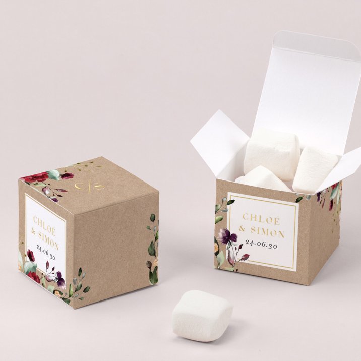 Como sugerencia podéis rellenarlas con nuestras peladillas elaboradas artesanalmente en el sur de Francia (propuestas como accesorio por separado). Os aconsejamos llenarlas con 20 peladillas por caja (50 g). Atención, las cajas vienen listas para montar.