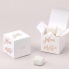 Esta cajita (de 5,4 x 5,4 cm) se puede rellenar con dulces, peladillas u otras sorpresas. Será un original regalo que podréis colocar sobre las mesas y regalar a vuestros invitados como recuerdo de vuestro maravilloso día.