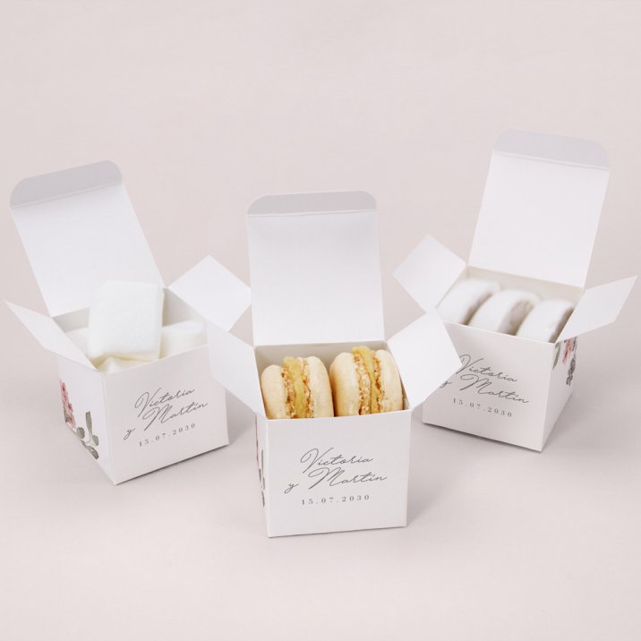 Esta cajita (de 5,4 x 5,4 cm) se puede rellenar con dulces, peladillas u otras sorpresas. Será un original regalo que podréis colocar sobre las mesas y regalar a vuestros invitados como recuerdo de vuestro maravilloso día.