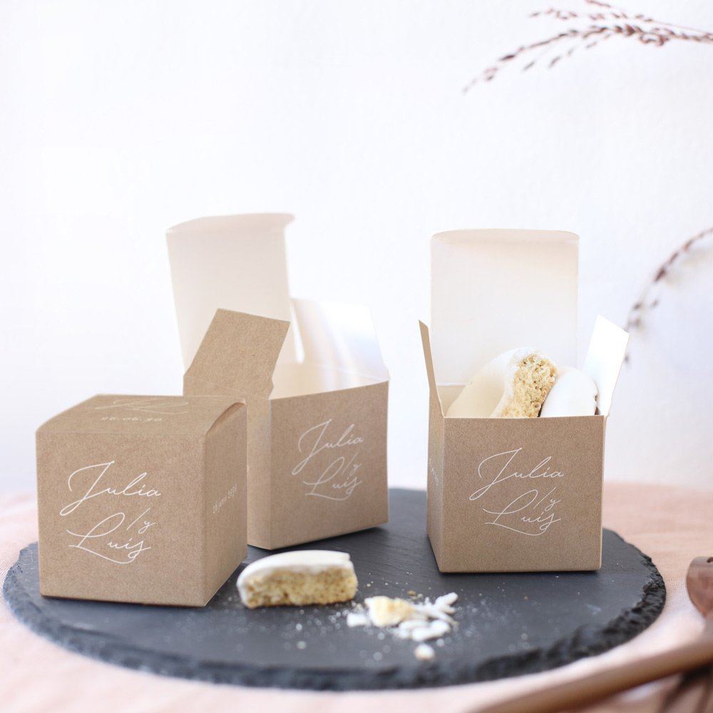Esta cajita (de 5,4 x 5,4 cm) se puede rellenar con dulces, peladillas u otras sorpresas. Será un original regalo que podréis colocar sobre las mesas y regalar a vuestros invitados como recuerdo de vuestro maravilloso día.