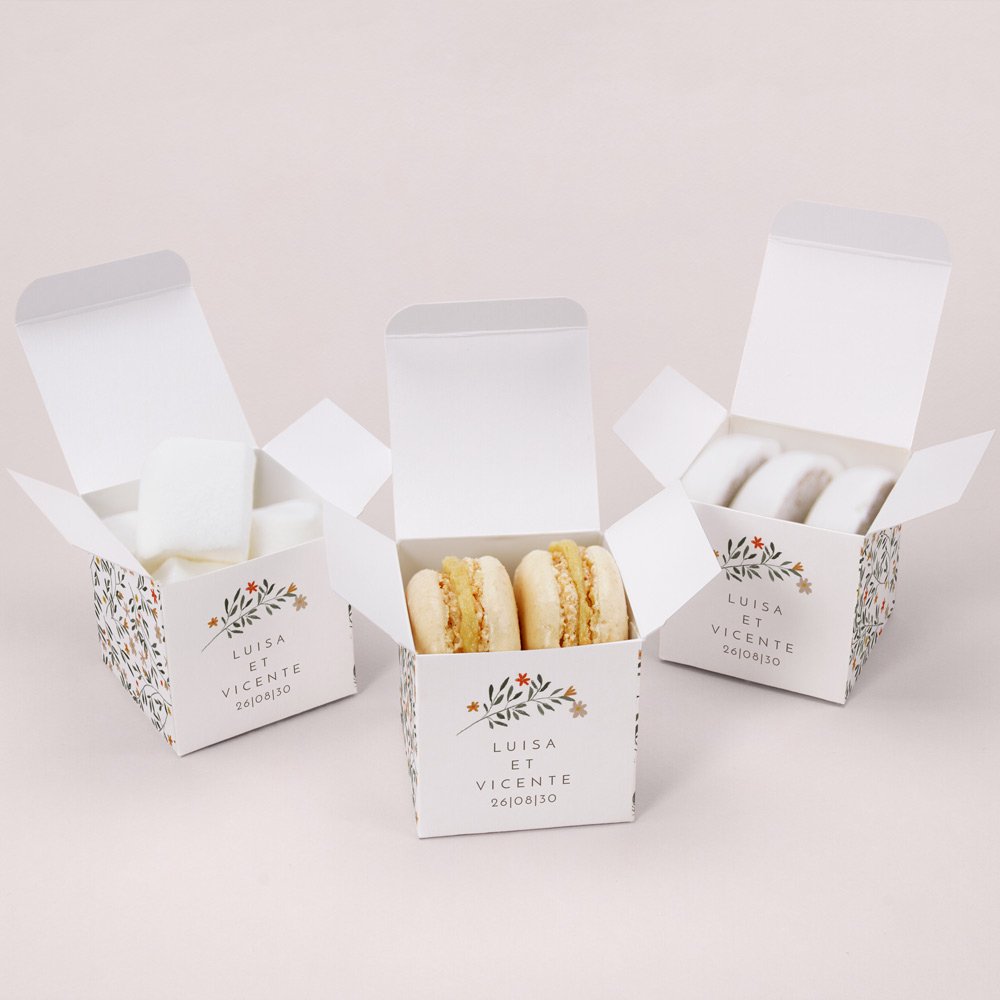 Como sugerencia podéis rellenarlas con nuestras peladillas elaboradas artesanalmente en el sur de Francia (propuestas como accesorio por separado). Os aconsejamos llenarlas con 20 peladillas por caja (50 g). Atención, las cajas vienen listas para montar.