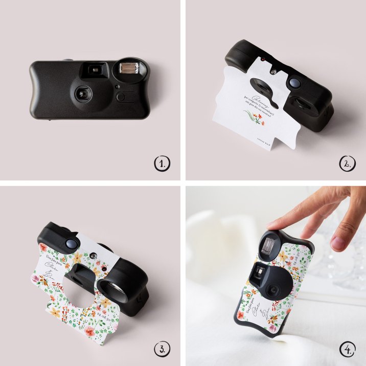 Colocada en cada mesa, esta cámara personalizada permitirá a tus invitados capturar la entrada de los novios, las mesas llenas de vida, las risas y todas las emociones de este día especial.