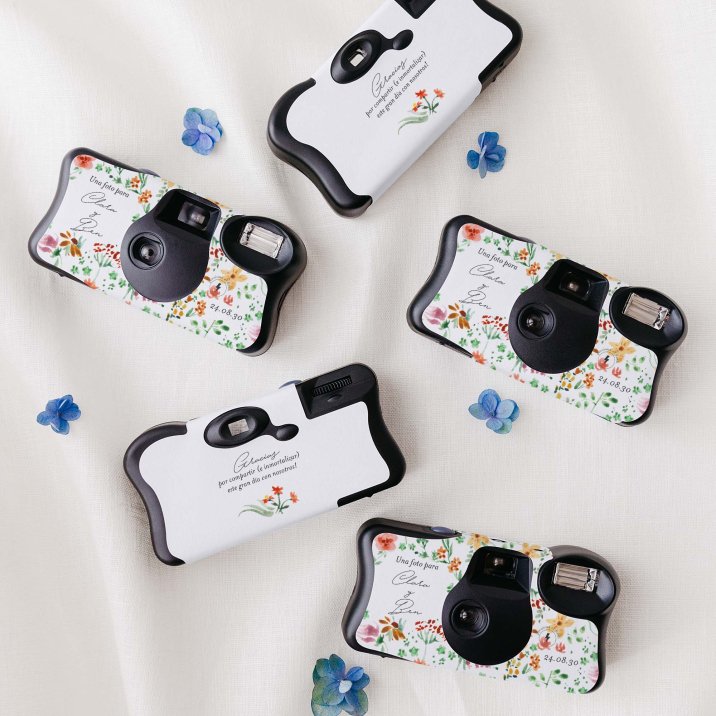Viste tu cámara desechable de boda con una etiqueta adhesiva personalizable, perfectamente adaptada al tema de tu gran día.