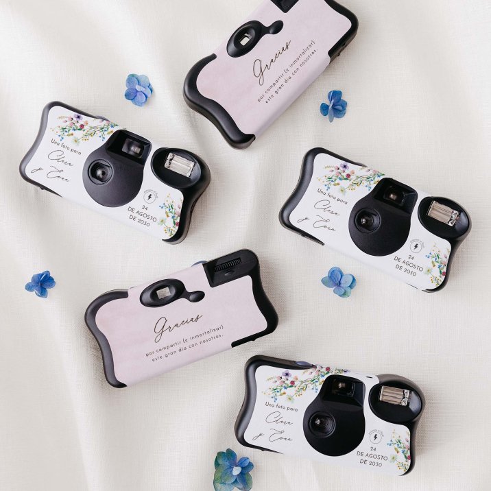 Viste tu cámara desechable de boda con una etiqueta adhesiva personalizable, perfectamente adaptada al tema de tu gran día.