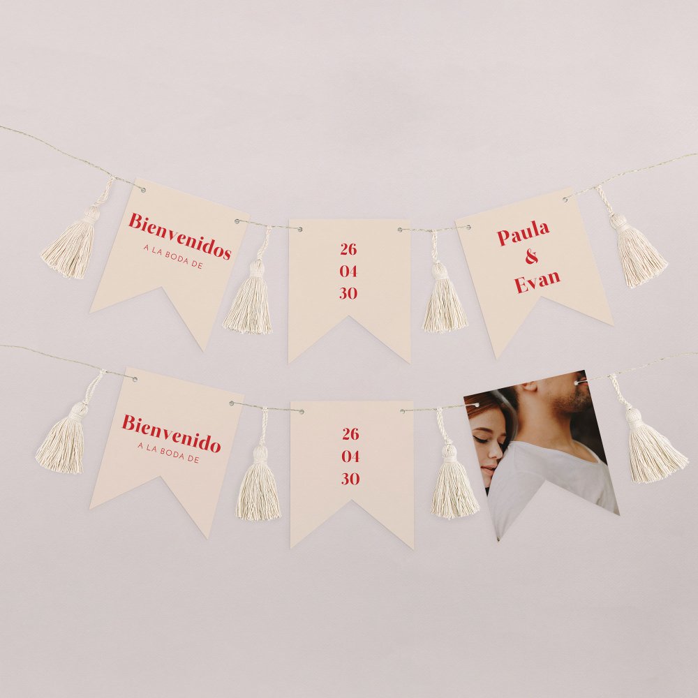 Esta guirnalda de 16 banderines recto-verso se personaliza con vuestros nombres, vuestra foto, la fecha de vuestra boda, un pequeño mensaje,...