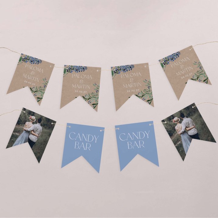 Esta guirnalda de 16 banderines recto-verso se personaliza con vuestros nombres, vuestra foto, la fecha de vuestra boda, un pequeño mensaje,...