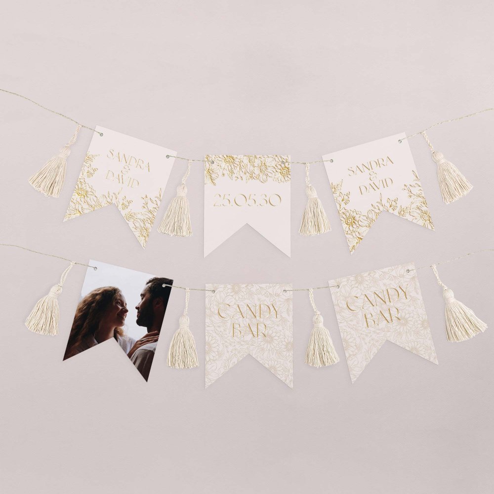 Esta guirnalda de 16 banderines recto-verso se personaliza con vuestros nombres, vuestra foto, la fecha de vuestra boda, un pequeño mensaje,...