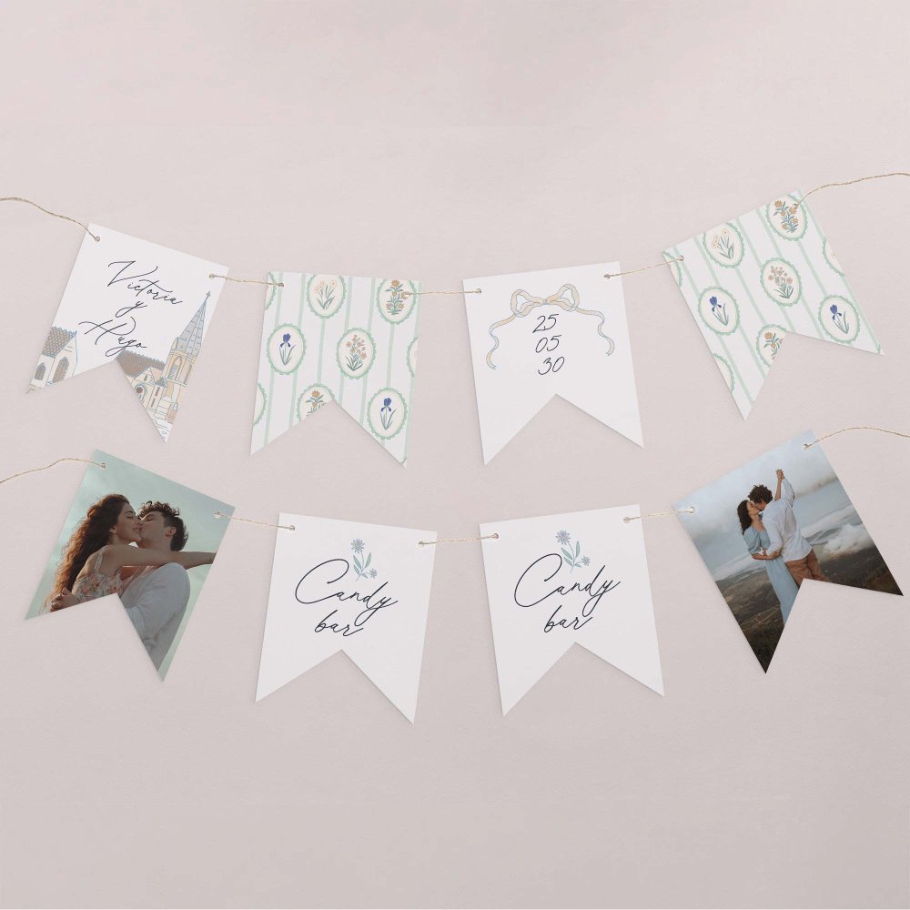 Esta guirnalda de 16 banderines recto-verso se personaliza con vuestros nombres, vuestra foto, la fecha de vuestra boda, un pequeño mensaje,...