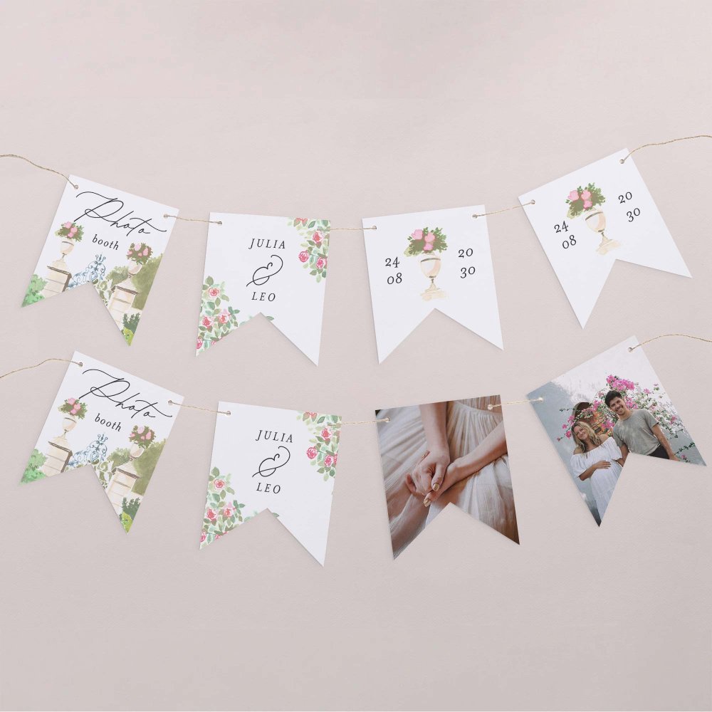 Esta guirnalda de 16 banderines recto-verso se personaliza con vuestros nombres, vuestra foto, la fecha de vuestra boda, un pequeño mensaje,...