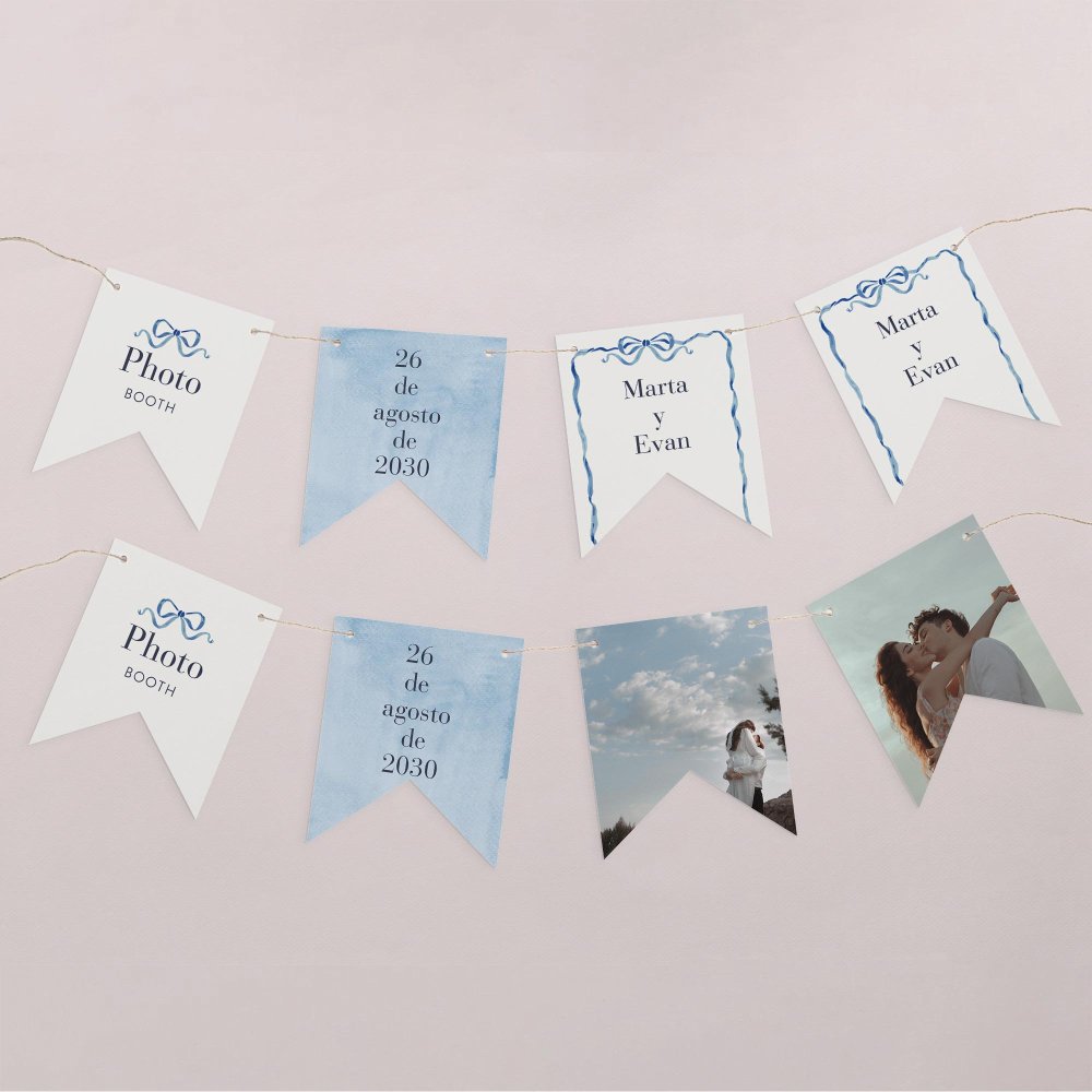 Esta guirnalda de 16 banderines recto-verso se personaliza con vuestros nombres, vuestra foto, la fecha de vuestra boda, un pequeño mensaje,...