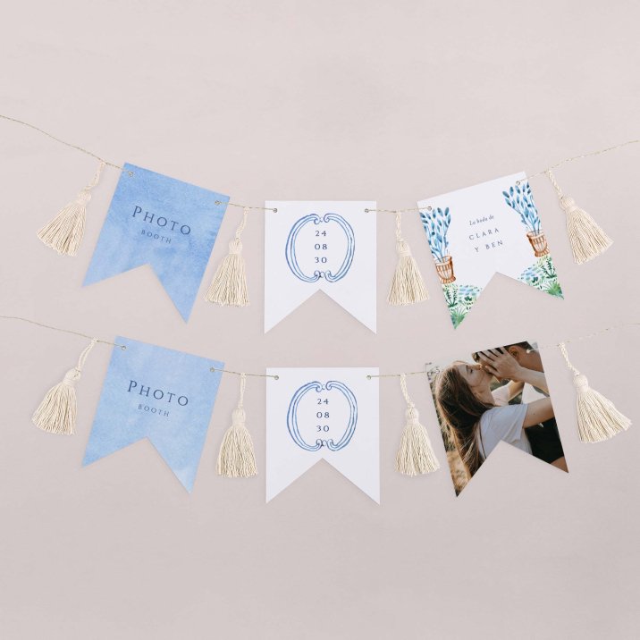 Esta guirnalda de 16 banderines recto-verso se personaliza con vuestros nombres, vuestra foto, la fecha de vuestra boda, un pequeño mensaje,...