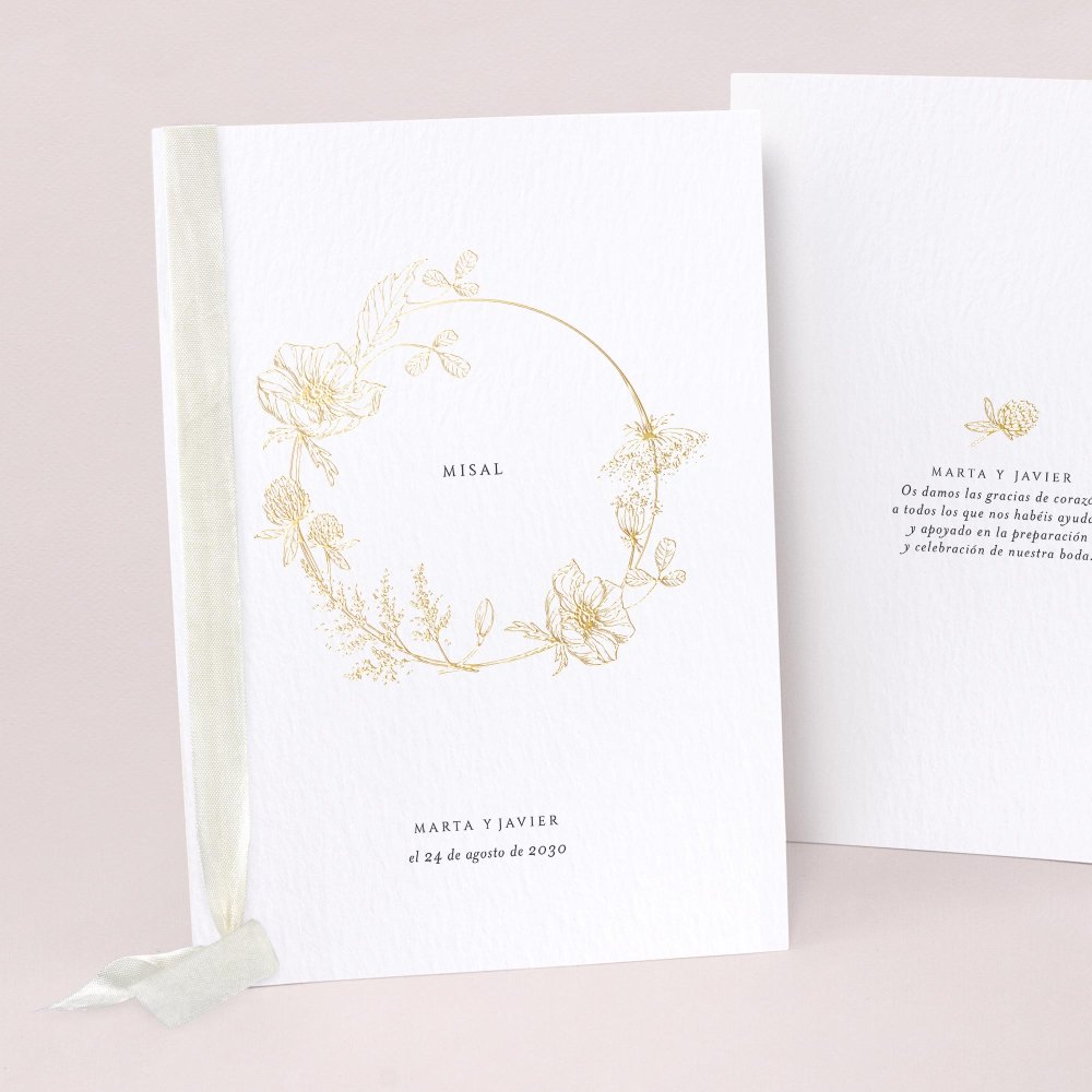 Cubierta de libro de misa en cartulina a juego con tu invitación. Se puede decorar con un lazo (se compra por separado, varios colores disponibles). Las hojas interiores no se suministran (sugerencia: Imprime las hojas interiores en papel A4, dóblalas y átalas con el lazo).