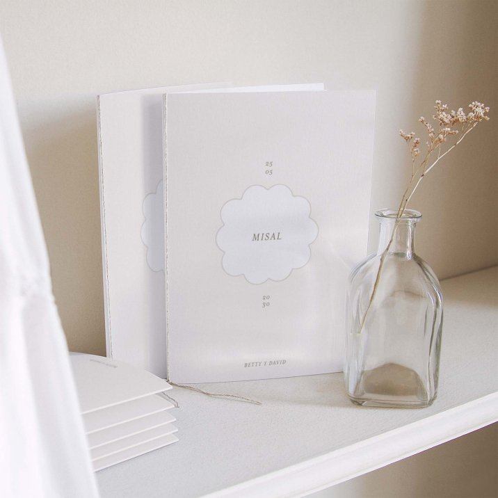 Cubierta de libro de misa en cartulina a juego con tu invitación. Se puede decorar con un lazo (se compra por separado, varios colores disponibles). Las hojas interiores no se suministran (sugerencia: Imprime las hojas interiores en papel A4, dóblalas y átalas con el lazo).