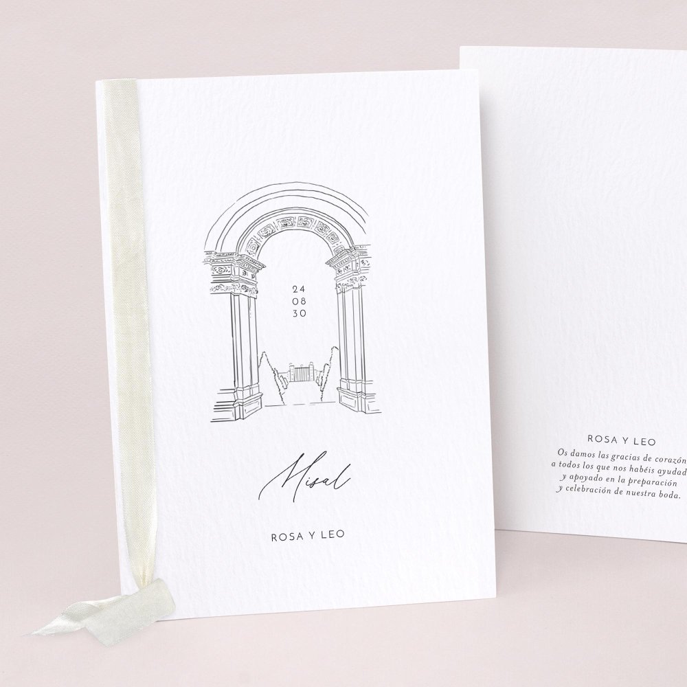 Cubierta de libro de misa en cartulina a juego con tu invitación. Se puede decorar con un lazo (se compra por separado, varios colores disponibles). Las hojas interiores no se suministran (sugerencia: Imprime las hojas interiores en papel A4, dóblalas y átalas con el lazo).