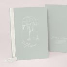 Cubierta de libro de misa en cartulina a juego con tu invitación. Se puede decorar con un lazo (se compra por separado, varios colores disponibles). Las hojas interiores no se suministran (sugerencia: Imprime las hojas interiores en papel A4, dóblalas y átalas con el lazo).