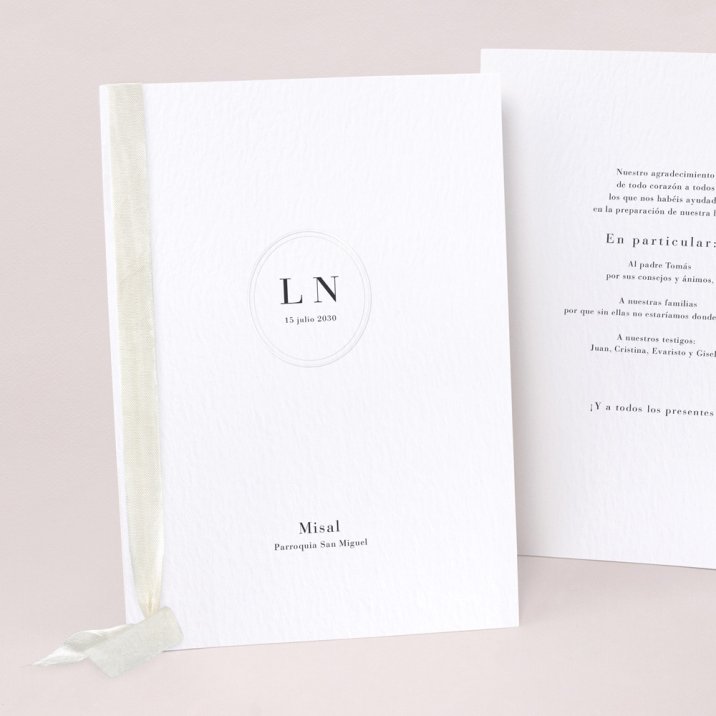 Cubierta de libro de misa en cartulina a juego con tu invitación. Se puede decorar con un lazo (se compra por separado, varios colores disponibles). Las hojas interiores no se suministran (sugerencia: Imprime las hojas interiores en papel A4, dóblalas y átalas con el lazo).