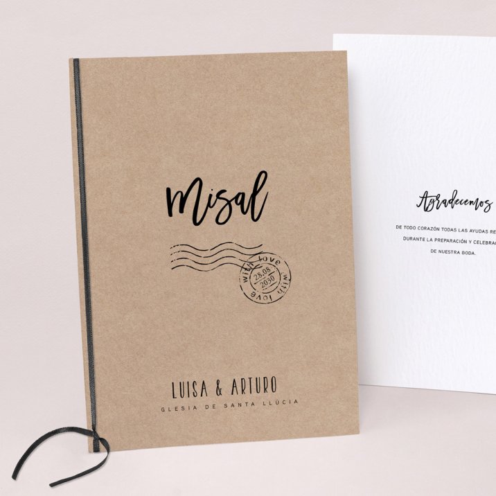 Cubierta de libro de misa en cartulina a juego con tu invitación. Se puede decorar con un lazo (se compra por separado, varios colores disponibles). Las hojas interiores no se suministran (sugerencia: Imprime las hojas interiores en papel A4, dóblalas y átalas con el lazo).