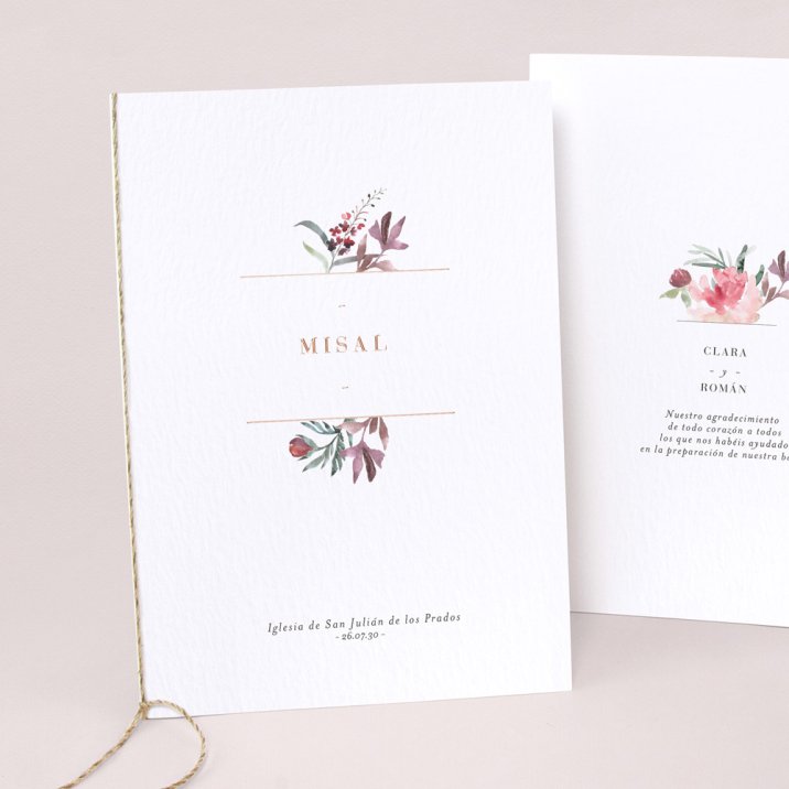 Cubierta de libro de misa en cartulina a juego con tu invitación. Se puede decorar con un lazo (se compra por separado, varios colores disponibles). Las hojas interiores no se suministran (sugerencia: Imprime las hojas interiores en papel A4, dóblalas y átalas con el lazo).