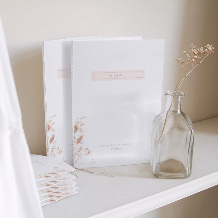 Cubierta de libro de misa en cartulina a juego con tu invitación. Se puede decorar con un lazo (se compra por separado, varios colores disponibles). Las hojas interiores no se suministran (sugerencia: Imprime las hojas interiores en papel A4, dóblalas y átalas con el lazo).
