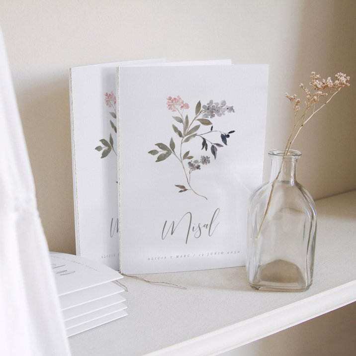 Cubierta de libro de misa en cartulina a juego con tu invitación. Se puede decorar con un lazo (se compra por separado, varios colores disponibles). Las hojas interiores no se suministran (sugerencia: Imprime las hojas interiores en papel A4, dóblalas y átalas con el lazo).