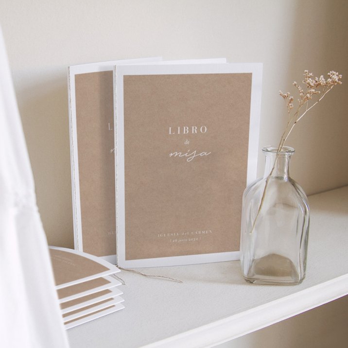 Cubierta de libro de misa en cartulina a juego con tu invitación. Se puede decorar con un lazo (se compra por separado, varios colores disponibles). Las hojas interiores no se suministran (sugerencia: Imprime las hojas interiores en papel A4, dóblalas y átalas con el lazo).