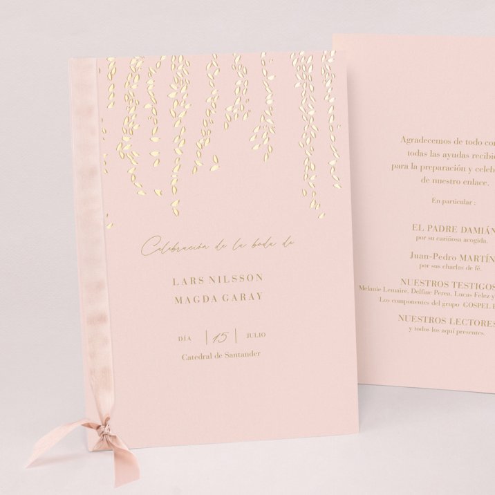 Cubierta de libro de misa en cartulina a juego con tu invitación. Se puede decorar con un lazo (se compra por separado, varios colores disponibles). Las hojas interiores no se suministran (sugerencia: Imprime las hojas interiores en papel A4, dóblalas y átalas con el lazo).