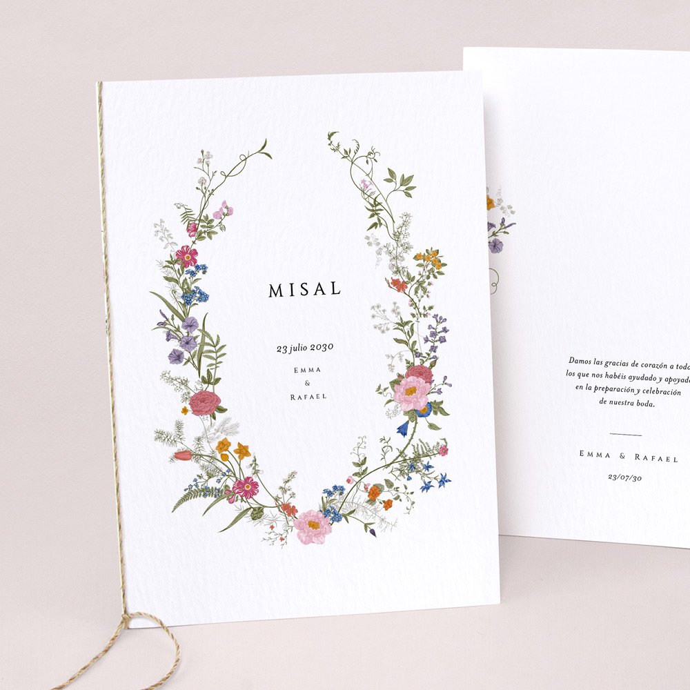 Cubierta de libro de misa en cartulina a juego con tu invitación. Se puede decorar con un lazo (se compra por separado, varios colores disponibles). Las hojas interiores no se suministran (sugerencia: Imprime las hojas interiores en papel A4, dóblalas y átalas con el lazo).