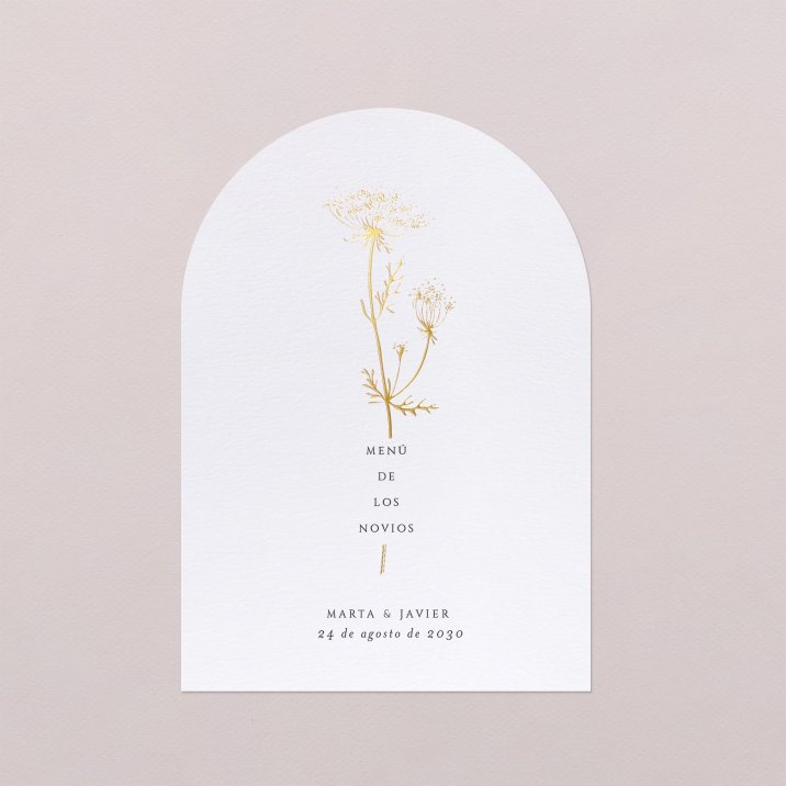 Con su elegante corte en forma de arco y a juego con su invitación, haz de este menú la decoración perfecta de las mesas. Complétala utilizando nuestros soportes de madera o decorando los menús con nuestros cordones y lazos (disponibles como accesorios).