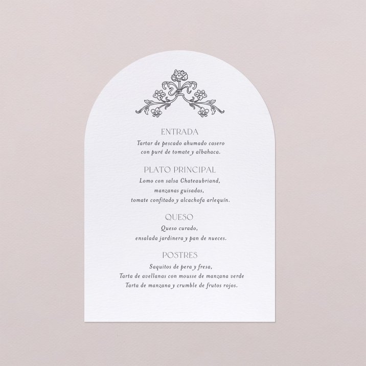 Con su elegante corte en forma de arco y a juego con su invitación, haz de este menú la decoración perfecta de las mesas. Complétala utilizando nuestros soportes de madera o decorando los menús con nuestros cordones y lazos (disponibles como accesorios).