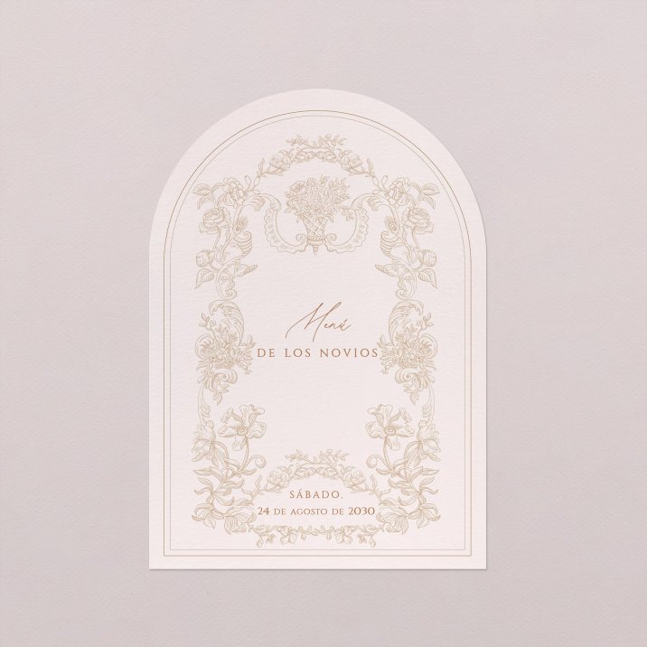 Con su elegante corte en forma de arco y a juego con su invitación, haz de este menú la decoración perfecta de las mesas. Complétala utilizando nuestros soportes de madera o decorando los menús con nuestros cordones y lazos (disponibles como accesorios).