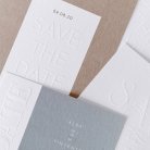 Para anunciar vuestra unión y que vuestros invitados puedan comenzar a anotarlo en su agenda, podéis enviarles este tipo de Save the date con relieve. Un detalle muy elegante gracias a una técnica de impresión de las letras para crear dicho relieve.