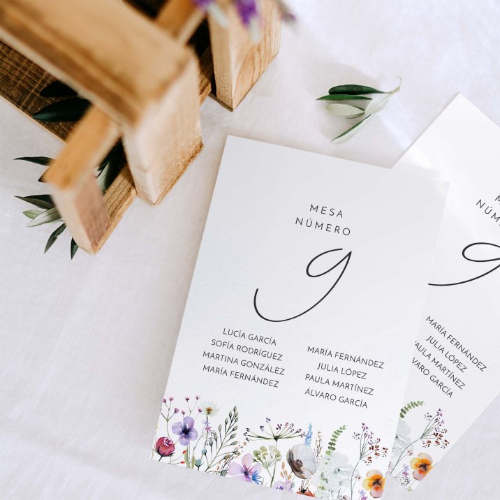 Hoja grande con los nombres de los invitados y sus respectivas mesas. Una hoja por mesa, cada una con su nombre (si tenéis un tema, como por ejemplo canciones, flores, lugares...), y la lista de las personas de esta mesa.