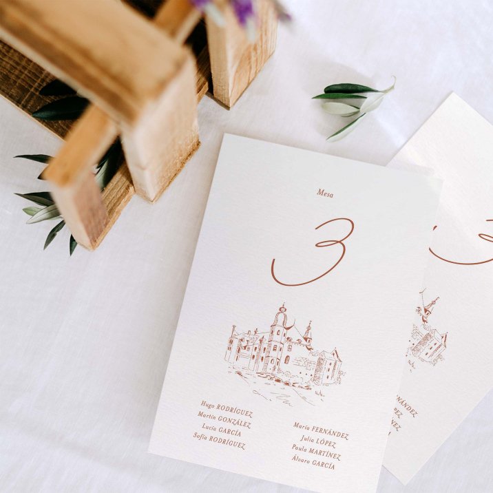 Tantas hojas como mesas, que colocareis en la entrada de la sala, para ayudar a tus invitados a encontrar su mesa mas fácilmente.