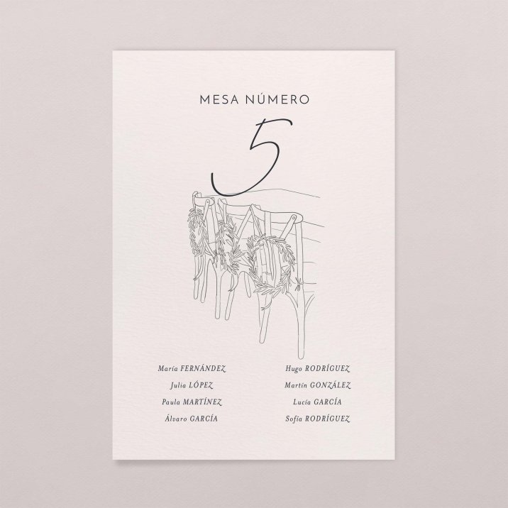 Hoja grande con los nombres de los invitados y sus respectivas mesas. Una hoja por mesa, cada una con su nombre (si tenéis un tema, como por ejemplo canciones, flores, lugares...), y la lista de las personas de esta mesa.