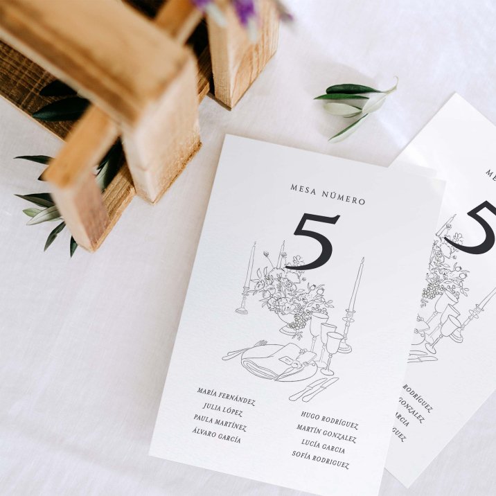 Hoja grande con los nombres de los invitados y sus respectivas mesas. Una hoja por mesa, cada una con su nombre (si tenéis un tema, como por ejemplo canciones, flores, lugares...), y la lista de las personas de esta mesa.