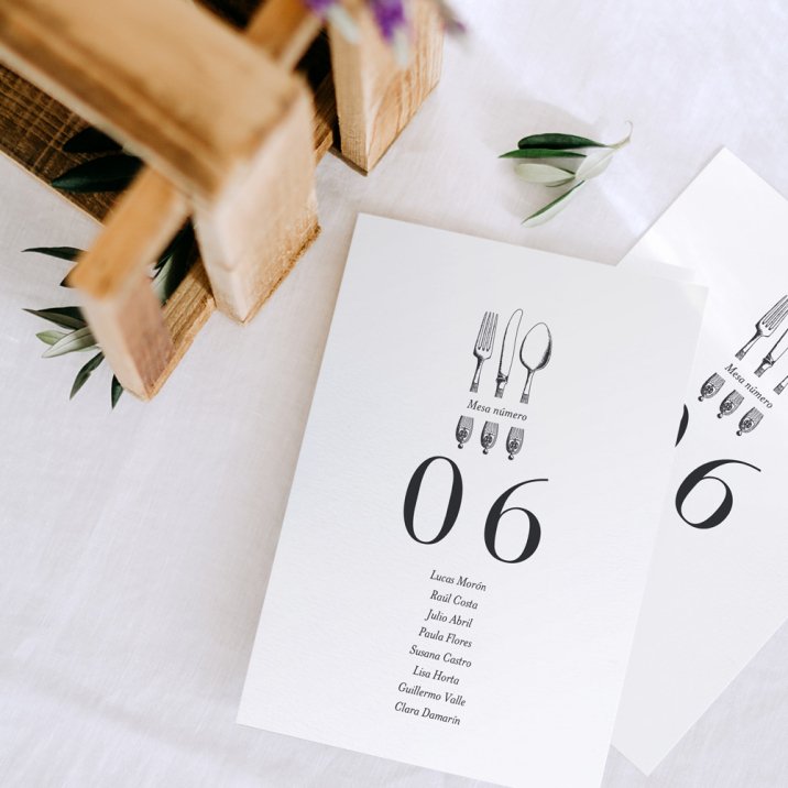 Hoja grande con los nombres de los invitados y sus respectivas mesas. Una hoja por mesa, cada una con su nombre (si tenéis un tema, como por ejemplo canciones, flores, lugares...), y la lista de las personas de esta mesa.