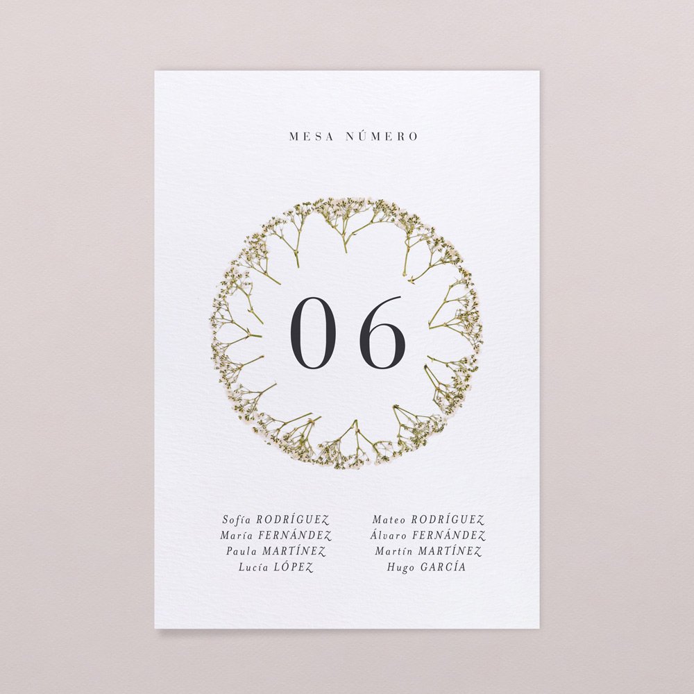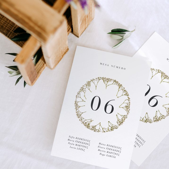 Hoja grande con los nombres de los invitados y sus respectivas mesas. Una hoja por mesa, cada una con su nombre (si tenéis un tema, como por ejemplo canciones, flores, lugares...), y la lista de las personas de esta mesa.