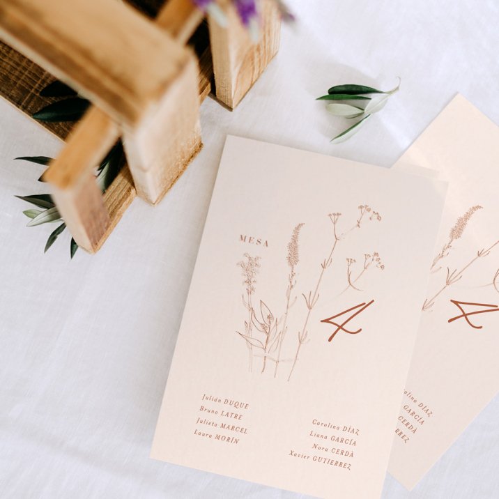 Hoja grande con los nombres de los invitados y sus respectivas mesas. Una hoja por mesa, cada una con su nombre (si tenéis un tema, como por ejemplo canciones, flores, lugares...), y la lista de las personas de esta mesa.