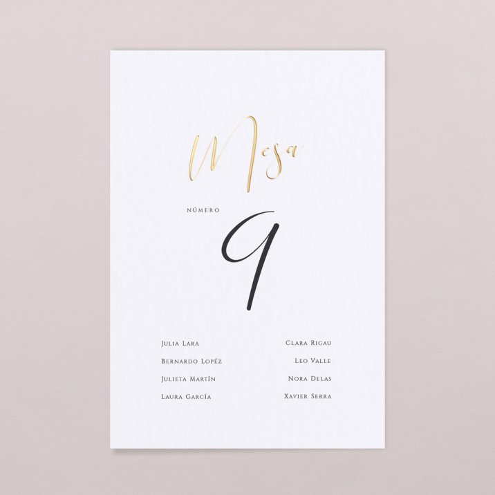 Hoja grande con los nombres de los invitados y sus respectivas mesas. Una hoja por mesa, cada una con su nombre (si tenéis un tema, como por ejemplo canciones, flores, lugares...), y la lista de las personas de esta mesa.