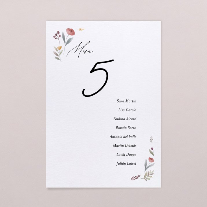 Hoja grande con los nombres de los invitados y sus respectivas mesas. Una hoja por mesa, cada una con su nombre (si tenéis un tema, como por ejemplo canciones, flores, lugares...), y la lista de las personas de esta mesa.