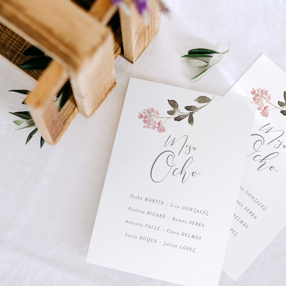 Hoja grande con los nombres de los invitados y sus respectivas mesas. Una hoja por mesa, cada una con su nombre (si tenéis un tema, como por ejemplo canciones, flores, lugares...), y la lista de las personas de esta mesa.