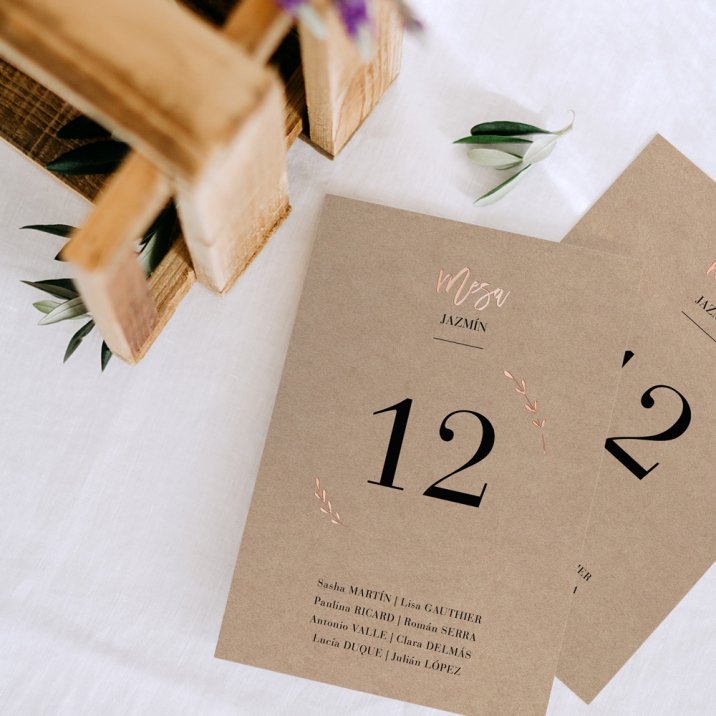 Tantas hojas como mesas, que colocareis en la entrada de la sala, para ayudar a tus invitados a encontrar su mesa mas fácilmente.